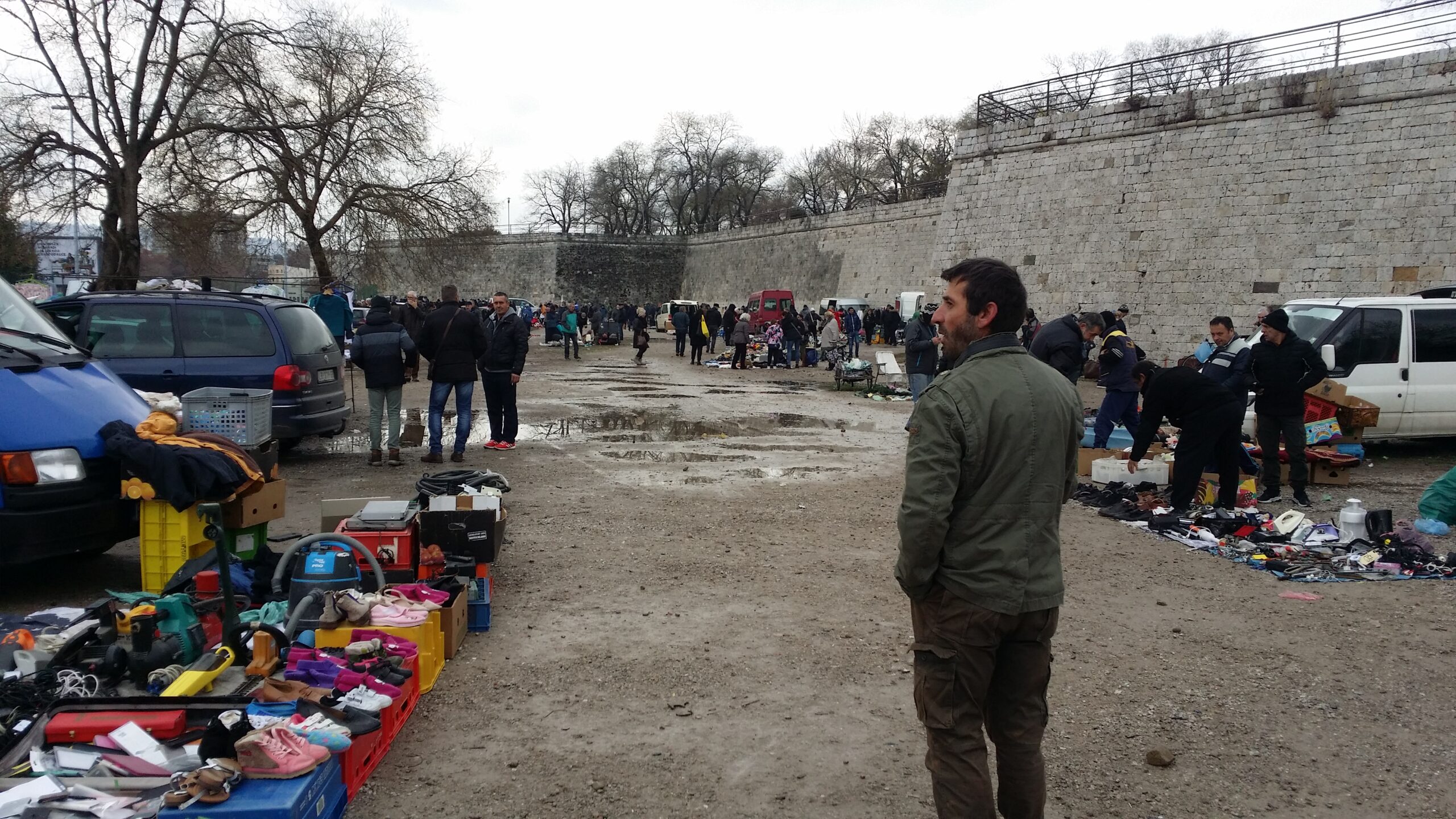 Prethodne noći je padala kiša, pa je prostor na kome se nalazi niški buvljak blatnjav, što prodavcima otežava izlaganje robe. Na gomilama je garderoba, pomešana ženska, dečja i muška, a svaki komad se prodaje po ceni od 50 dinara, ili tri odevna predmeta za sto dinara, kad je akcija.